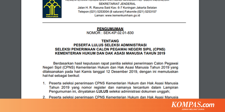 JAKARTA, KOMPAS.com - Bagi para peserta seleksi Penerimaan CPNS Kementerian Hukum dan Hak Asasi Manusia Tahun 2019 yang nomor register dan namanya tercantum dalam Lampiran Pengumuman CPNS Kemenkumham dinyatakan LULUS seleksi.