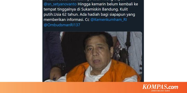 "Netizen. Butuh bantuannya telah hilang Bapak @sn_setyanovanto, Hingga kemarin belum kembali ke tempat tinggalnya di Sukamiskin Bandung. Kulit putih.Usia 62 tahun. Ada hadiah bagi siapapun yang memberikan informasi. Cc @Kemenkumham_RI, @OmbudsmanRI137".